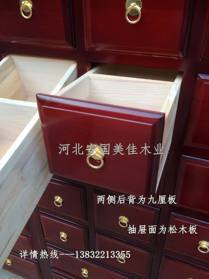 中藥柜用料---框架和抽屜選用優(yōu)質(zhì)樟松木,抽屜下面有五合板封底,防串味,抽屜底選用七合板,中藥柜的后背兩側(cè)頂部選用九厘板。抽屜面為松木整塊板。